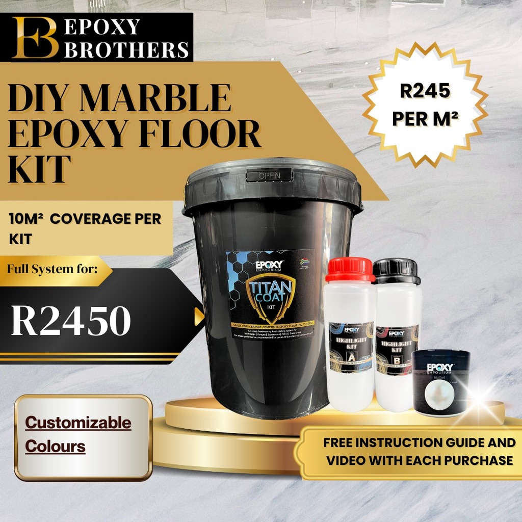 The DIY Marble Kit is a decorative solution designed for individuals to create stunningmarble finishes on smooth cement floors and similar surfaces, all from the comfort of theirown home or workspace.This kit allows users to achieve a luxurious, high-end marble effect with customizable colors,depending on the pigments provided in the kit.With easy-to-follow instructions and multiple color options, anyone can personalize theirspace to match their desired aesthetic.Titan Coat epoxy is an industrial-grade, two-component coating that chemically cures into a hard, durable finish. It's designed to protect surfaces—such as concrete floors, metal structures, and more—from abrasion, chemicals, and heavy traffic while delivering a high-gloss, visually appealing result.